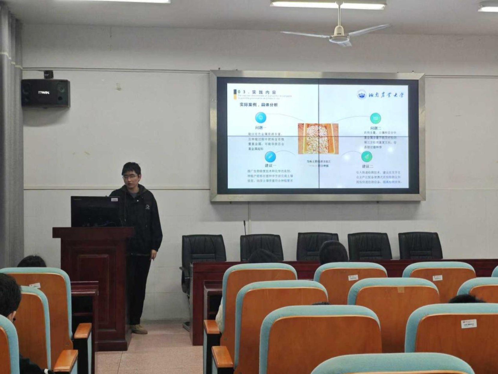 队员高柯钒代表团队进行介绍。该团队由公司苏招红副教授带队,10名硕士研究生和本科生党员组成。他们深入邵阳市隆回县荷香桥镇火花村,围绕龙牙百合种植,开展了田间取样、土壤快速检测与技术培训等一系列实践活动。