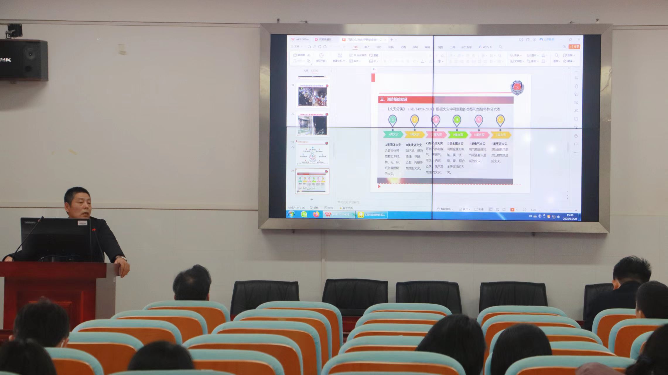 此次讲座以“人人讲安全,个个会应急”为核心主题。张旭文结合冬季校园防火形势严峻、用电需求攀升的季节特点,系统阐述了校园消防安全工作的重大意义。他通过列举社会场所及校园环境中的多起真实火灾案例,并辅以详实的数据,深入剖析了火灾事故的成因与深刻教训,清晰展现了违规操作、应急处置失当可能引发的人员伤亡、财产损失等严重后果,为全体教职工敲响了消防安全的警钟。
